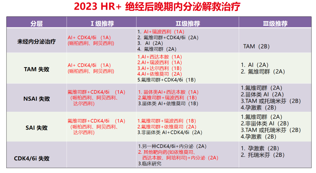 1.I级推荐调整为“氟维司群+CDK4/6i(哌柏西利、阿贝西利、达尔西利)”;
